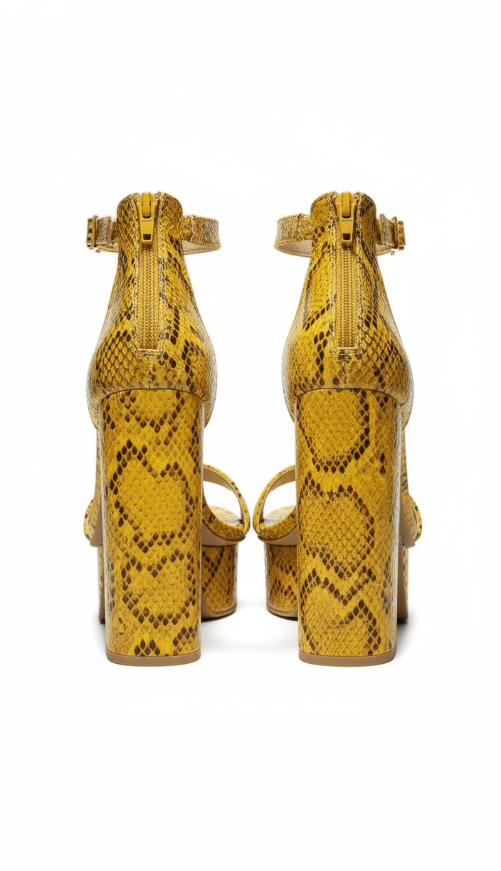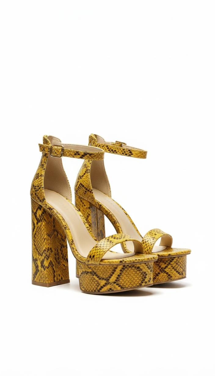 Open toe ankle strap platform sandals. Chunky heel, back zipper, snake textured